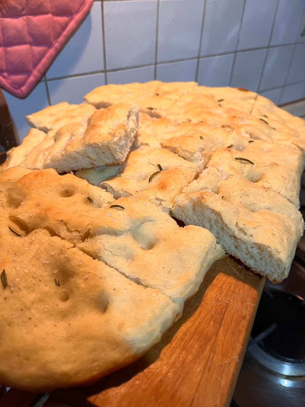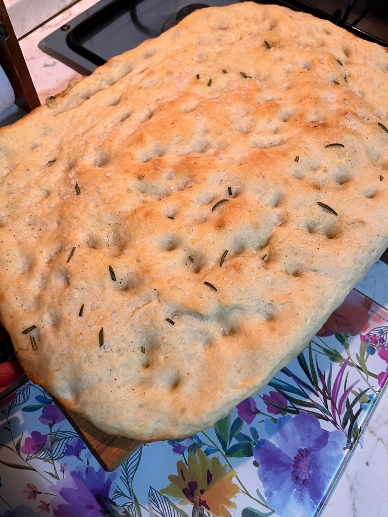 La nostra focaccia è pronta da gustare in famiglia, per una cena o una merenda con i vostri bambini 🙂 a noi è piaciuta tantissimo e non vedo l’ora di rifarla!